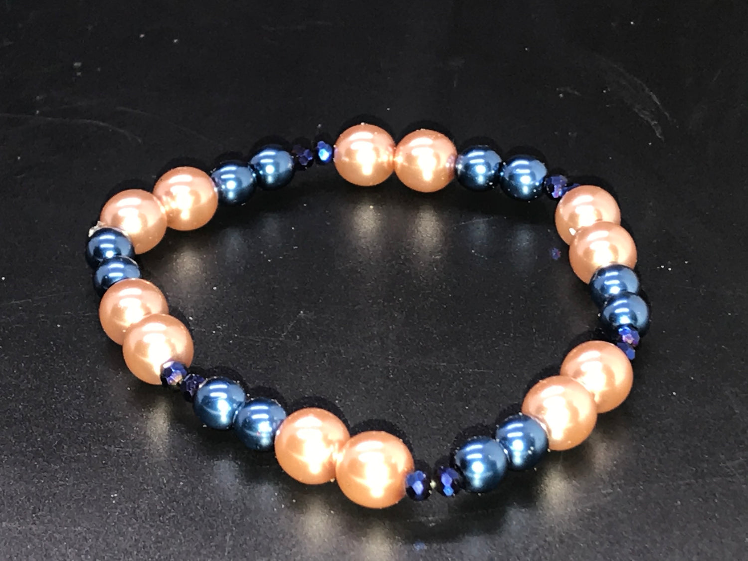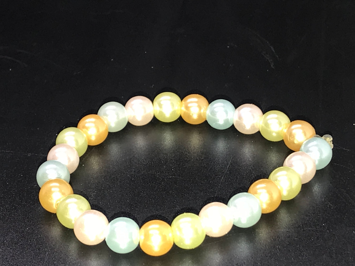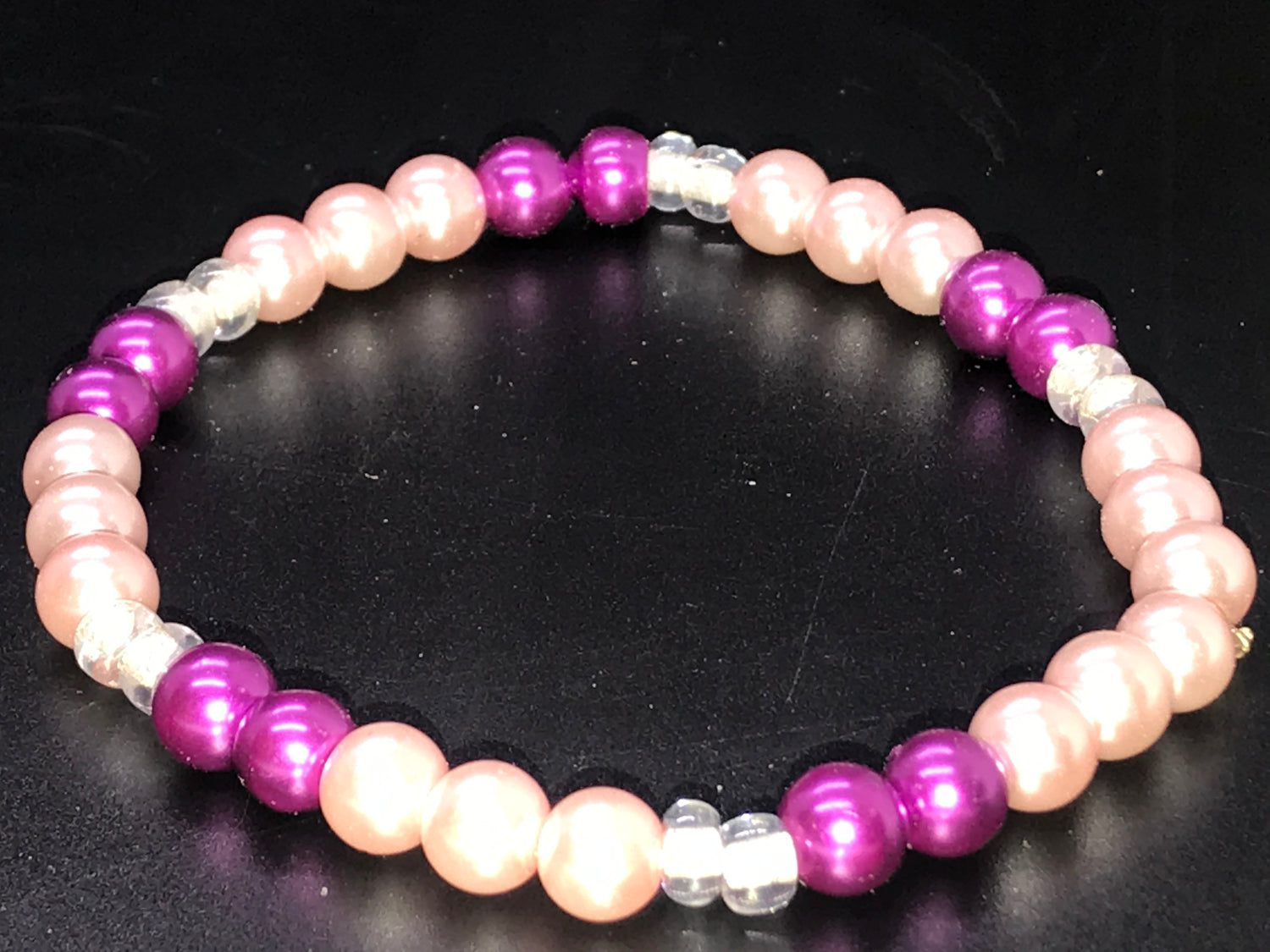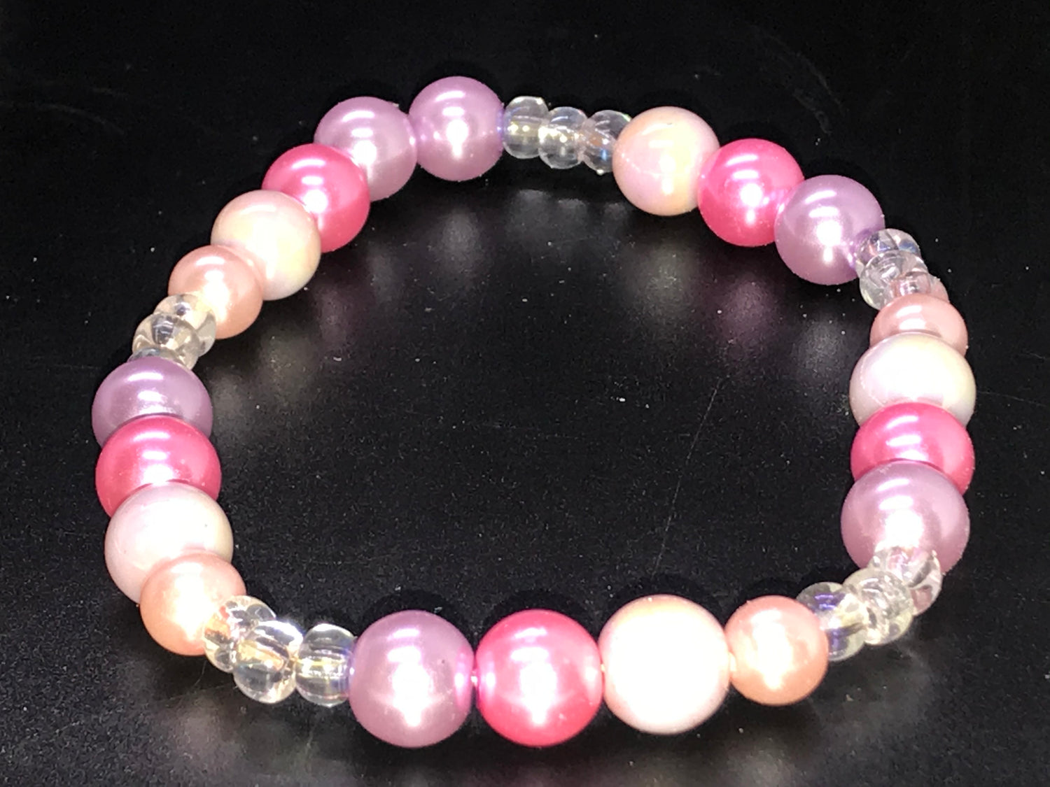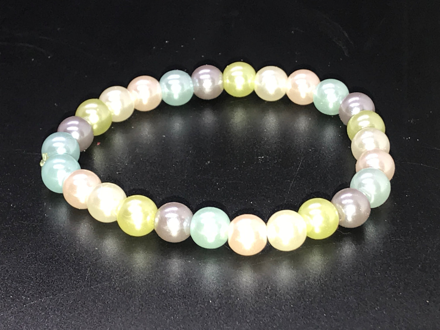 These uniquely handmade bracelets were made by Christy Z. They are made with elastic along with an assortment of either natural stones, blown or stained glass, semi precious stones, crystals, or petrified wood, resin or acrylic.