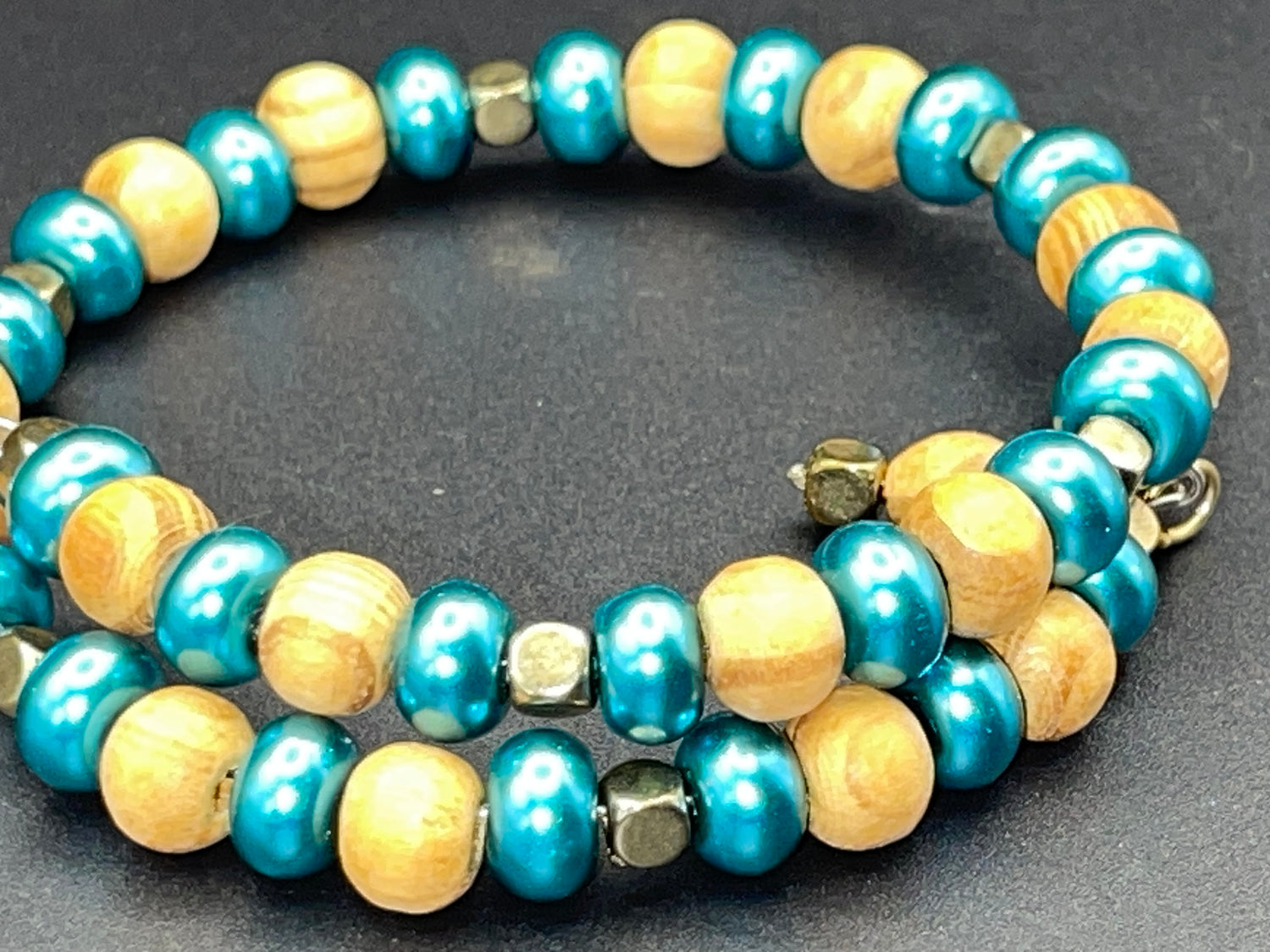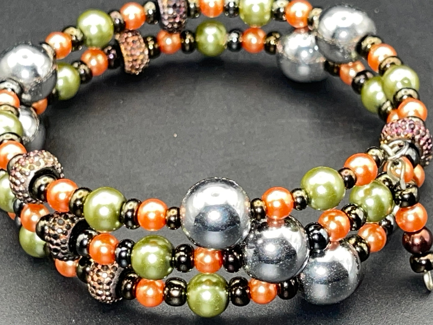 These uniquely handmade Double Loop Bracelets were made by Catina or Gregorio with sterling silver plated memory wire and a assortment of either natural stones, blown or stained glass, semi precious stones, crystals, or petrified wood resin, or acrylic.